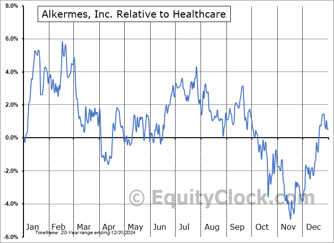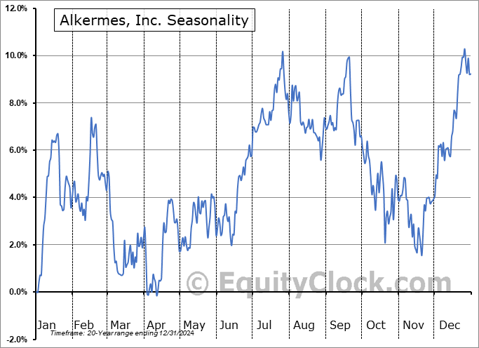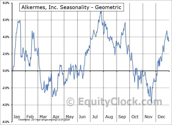 Analysis of the Alkermes, Inc. (NASD:ALKS) seasonal charts above shows that a Buy Date of October 20 and a Sell Date of January 10 has resulted in a geometric average return of 6.72% above the benchmark rate of the S&P 500 Total Return Index over the past 20 years. This seasonal timeframe has shown positive results compared to the benchmark in 15 of those periods. This is a good rate of success and the return strongly outperforms the relative buy-and-hold performance of the stock over the past 20 years by an average of 12.54% per year.