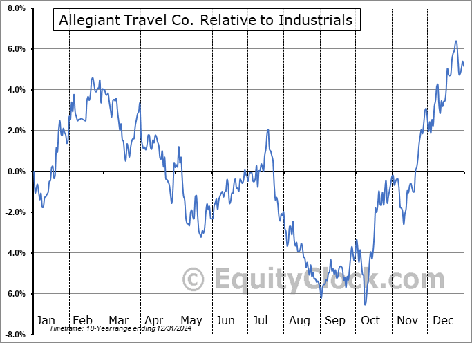 Analysis of the Allegiant Travel Co. (NASD:ALGT) seasonal charts above shows that a Buy Date of September 20 and a Sell Date of December 23 has resulted in a geometric average return of 11.7% above the benchmark rate of the S&P 500 Total Return Index over the past 18 years. This seasonal timeframe has shown positive results compared to the benchmark in 15 of those periods. This is a very good rate of success and the return strongly outperforms the relative buy-and-hold performance of the stock over the past 18 years by an average of 13.55% per year.