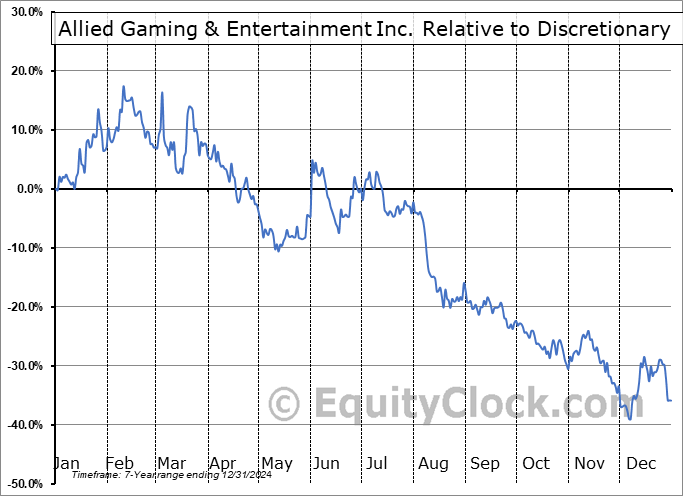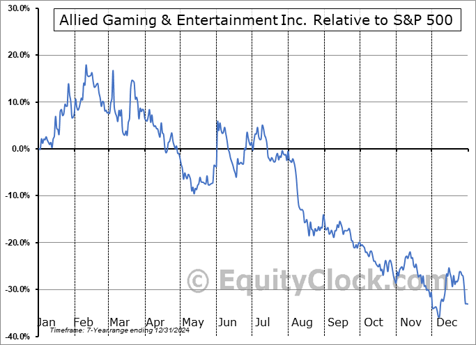 Analysis of the Allied Gaming & Entertainment Inc. (NASD:AGAE) seasonal charts above shows that a Buy Date of December 1 and a Sell Date of February 24 has resulted in a geometric average return of 17.24% above the benchmark rate of the S&P 500 Total Return Index over the past 7 years. This seasonal timeframe has shown positive results compared to the benchmark in 6 of those periods. This is a very good rate of success and the return strongly outperforms the relative buy-and-hold performance of the stock over the past 7 years by an average of 55.58% per year.