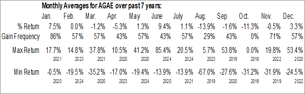 A word of caution: Only 7 years of data is available for shares of AGAE, perhaps insufficient to create a seasonal profile that accurately gauges the seasonal tendencies influencing the investment. Ideally, while 20 years is preferred, at least 10 years of data is required to perform a seasonal analysis that is considered to be reliable for future seasonal periods.