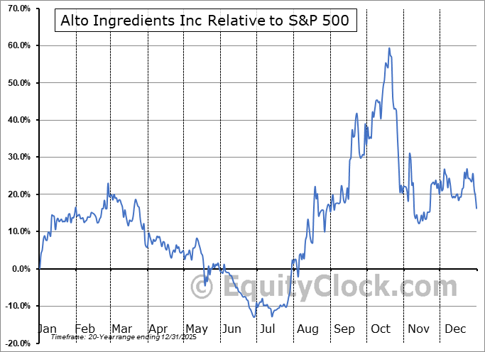 Analysis of the Alto Ingredients Inc (NASD:ALTO) seasonal charts above shows that a Buy Date of November 14 and a Sell Date of February 14 has resulted in a geometric average return of 10.05% above the benchmark rate of the S&P 500 Total Return Index over the past 20 years. This seasonal timeframe has shown positive results compared to the benchmark in 11 of those periods. This is a fair rate of success and the return strongly outperforms the relative buy-and-hold performance of the stock over the past 20 years by an average of 43.39% per year.