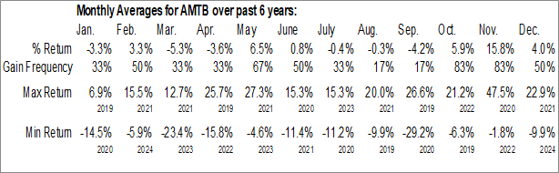 A word of caution: Only 6 years of data is available for shares of AMTB, perhaps insufficient to create a seasonal profile that accurately gauges the seasonal tendencies influencing the investment. Ideally, while 20 years is preferred, at least 10 years of data is required to perform a seasonal analysis that is considered to be reliable for future seasonal periods.
