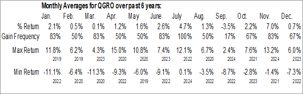 A word of caution: Only 6 years of data is available for shares of QGRO, perhaps insufficient to create a seasonal profile that accurately gauges the seasonal tendencies influencing the investment. Ideally, while 20 years is preferred, at least 10 years of data is required to perform a seasonal analysis that is considered to be reliable for future seasonal periods.