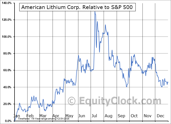 Analysis of the American Lithium Corp. (TSXV:LI.V) seasonal charts above shows that a Buy Date of August 17 and a Sell Date of November 5 has resulted in a geometric average return of 7.33% above the benchmark rate of the S&P 500 Total Return Index over the past 15 years. This seasonal timeframe has shown positive results compared to the benchmark in 9 of those periods. This is a fair rate of success and the return strongly outperforms the relative buy-and-hold performance of the stock over the past 15 years by an average of 34.12% per year.