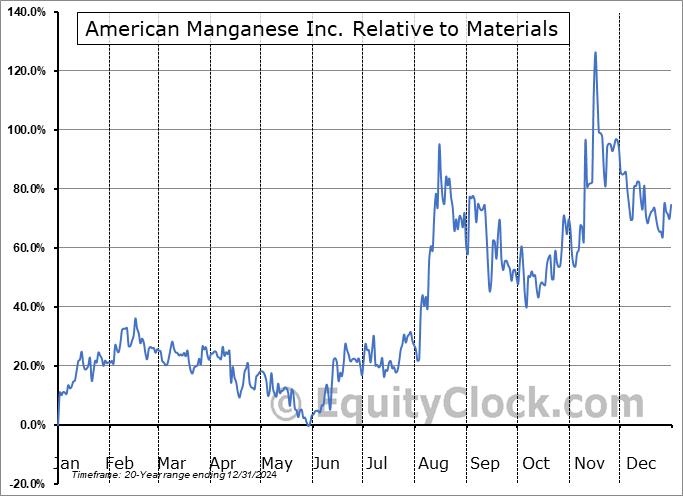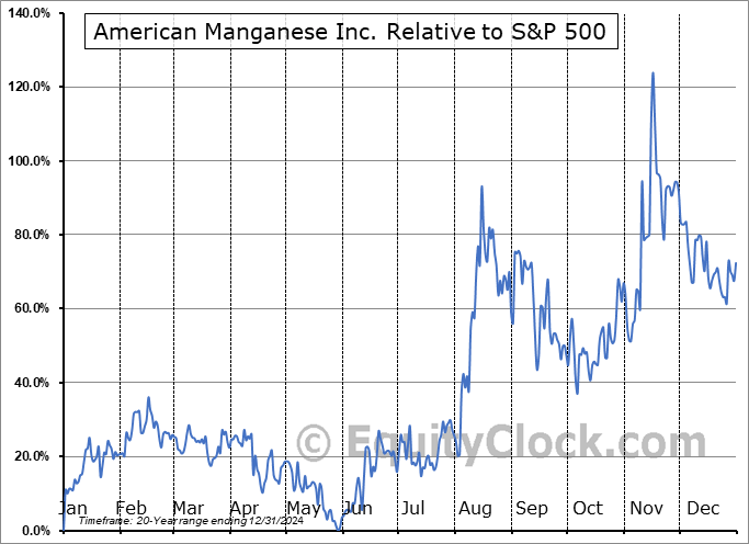 Analysis of the American Manganese Inc. (OTCMKT:AMYZF) seasonal charts above shows that a Buy Date of October 21 and a Sell Date of January 19 has resulted in a geometric average return of 8.6% above the benchmark rate of the S&P 500 Total Return Index over the past 20 years. This seasonal timeframe has shown positive results compared to the benchmark in 14 of those periods. This is a good rate of success and the return strongly outperforms the relative buy-and-hold performance of the stock over the past 20 years by an average of 23.26% per year.
