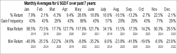 A word of caution: Only 6 years of data is available for shares of USGDF, perhaps insufficient to create a seasonal profile that accurately gauges the seasonal tendencies influencing the investment. Ideally, while 20 years is preferred, at least 10 years of data is required to perform a seasonal analysis that is considered to be reliable for future seasonal periods.