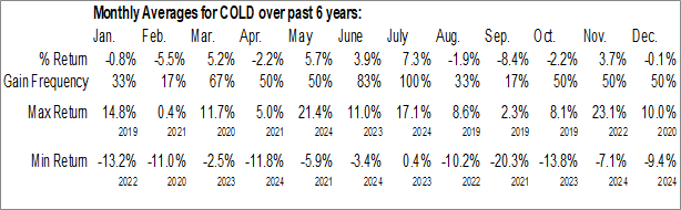 A word of caution: Only 6 years of data is available for shares of COLD, perhaps insufficient to create a seasonal profile that accurately gauges the seasonal tendencies influencing the investment. Ideally, while 20 years is preferred, at least 10 years of data is required to perform a seasonal analysis that is considered to be reliable for future seasonal periods.