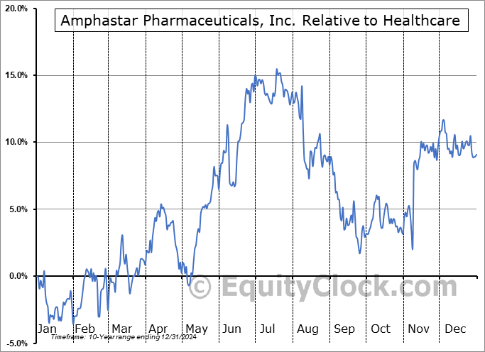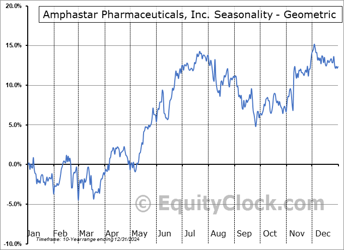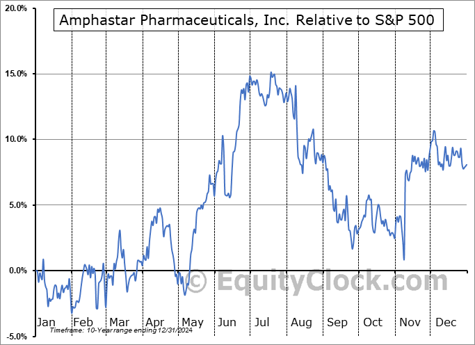 Analysis of the Amphastar Pharmaceuticals, Inc. (NASD:AMPH) seasonal charts above shows that a Buy Date of April 18 and a Sell Date of July 26 has resulted in a geometric average return of 7.65% above the benchmark rate of the S&P 500 Total Return Index over the past 10 years. This seasonal timeframe has shown positive results compared to the benchmark in 8 of those periods. This is a very good rate of success and the return strongly outperforms the relative buy-and-hold performance of the stock over the past 10 years by an average of 8.44% per year.