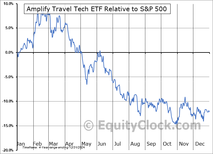Analysis of the Amplify Travel Tech ETF (AMEX:AWAY) seasonal charts above shows that a Buy Date of November 30 and a Sell Date of February 18 has resulted in a geometric average return of 8.85% above the benchmark rate of the S&P 500 Total Return Index over the past 4 years. This seasonal timeframe has shown positive results compared to the benchmark in 4 of those periods. This is an excellent rate of success and the return strongly outperforms the relative buy-and-hold performance of the stock over the past 4 years by an average of 24.75% per year.