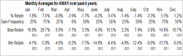 A word of caution: Only 4 years of data is available for shares of AWAY, perhaps insufficient to create a seasonal profile that accurately gauges the seasonal tendencies influencing the investment. Ideally, while 20 years is preferred, at least 10 years of data is required to perform a seasonal analysis that is considered to be reliable for future seasonal periods.