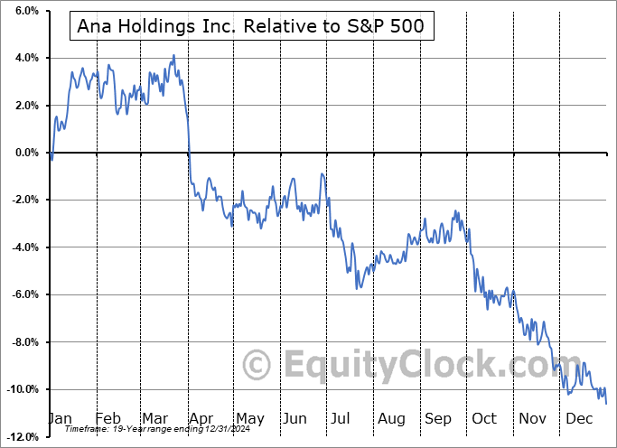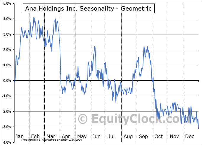 Analysis of the Ana Holdings Inc. (OTCMKT:ALNPY) seasonal charts above shows that a Buy Date of December 2 and a Sell Date of March 22 has resulted in a geometric average return of 2.89% above the benchmark rate of the S&P 500 Total Return Index over the past 19 years. This seasonal timeframe has shown positive results compared to the benchmark in 13 of those periods. This is a good rate of success and the return strongly outperforms the relative buy-and-hold performance of the stock over the past 19 years by an average of 15.71% per year.