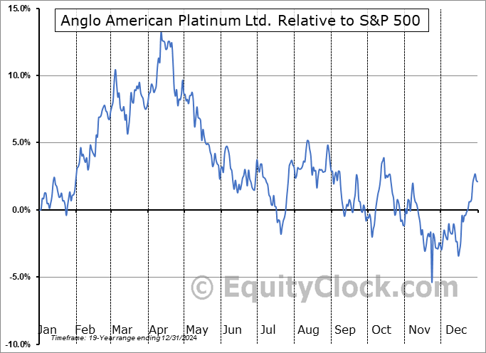 Analysis of the Anglo American Platinum Ltd. (OTCMKT:ANGPY) seasonal charts above shows that a Buy Date of November 23 and a Sell Date of February 21 has resulted in a geometric average return of 19.32% above the benchmark rate of the S&P 500 Total Return Index over the past 19 years. This seasonal timeframe has shown positive results compared to the benchmark in 15 of those periods. This is a good rate of success and the return strongly outperforms the relative buy-and-hold performance of the stock over the past 19 years by an average of 29.96% per year.