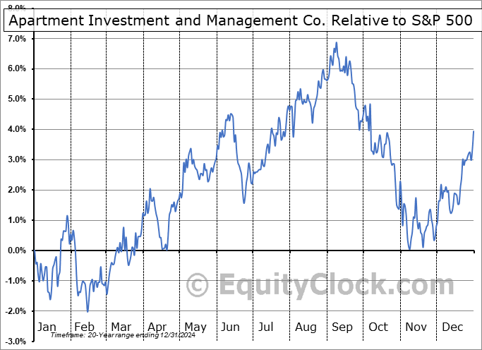 Analysis of the Apartment Investment and Management Co. (NYSE:AIV) seasonal charts above shows that a Buy Date of April 20 and a Sell Date of September 9 has resulted in a geometric average return of 6.03% above the benchmark rate of the S&P 500 Total Return Index over the past 20 years. This seasonal timeframe has shown positive results compared to the benchmark in 16 of those periods. This is a very good rate of success and the return strongly outperforms the relative buy-and-hold performance of the stock over the past 20 years by an average of 6.24% per year.