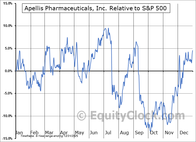Analysis of the Apellis Pharmaceuticals, Inc. (NASD:APLS) seasonal charts above shows that a Buy Date of November 18 and a Sell Date of March 10 has resulted in a geometric average return of 15.95% above the benchmark rate of the S&P 500 Total Return Index over the past 7 years. This seasonal timeframe has shown positive results compared to the benchmark in 7 of those periods. This is an excellent rate of success and the return strongly outperforms the relative buy-and-hold performance of the stock over the past 7 years by an average of 28.59% per year.