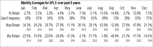 A word of caution: Only 7 years of data is available for shares of APLS, perhaps insufficient to create a seasonal profile that accurately gauges the seasonal tendencies influencing the investment. Ideally, while 20 years is preferred, at least 10 years of data is required to perform a seasonal analysis that is considered to be reliable for future seasonal periods.