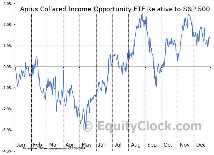 Analysis of the Aptus Collared Income Opportunity ETF (AMEX:ACIO) seasonal charts above shows that a Buy Date of February 7 and a Sell Date of May 3 has resulted in a geometric average return of 2.45% above the benchmark rate of the S&P 500 Total Return Index over the past 5 years. This seasonal timeframe has shown positive results compared to the benchmark in 4 of those periods. This is a very good rate of success and the return strongly outperforms the relative buy-and-hold performance of the stock over the past 5 years by an average of 5.93% per year.
