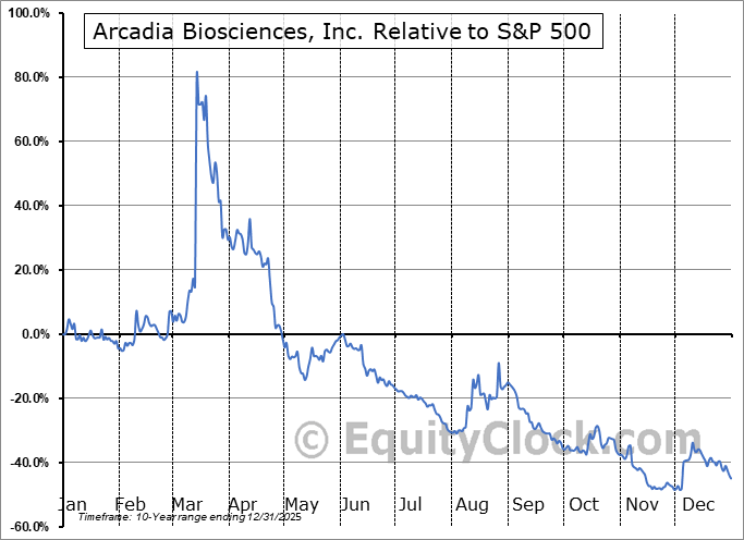 Analysis of the Arcadia Biosciences, Inc. (NASD:RKDA) seasonal charts above shows that a Buy Date of January 13 and a Sell Date of April 24 has resulted in a geometric average return of 2.09% above the benchmark rate of the S&P 500 Total Return Index over the past 9 years. This seasonal timeframe has shown positive results compared to the benchmark in 5 of those periods. This is a fair rate of success and the return strongly outperforms the relative buy-and-hold performance of the stock over the past 9 years by an average of 57.48% per year.