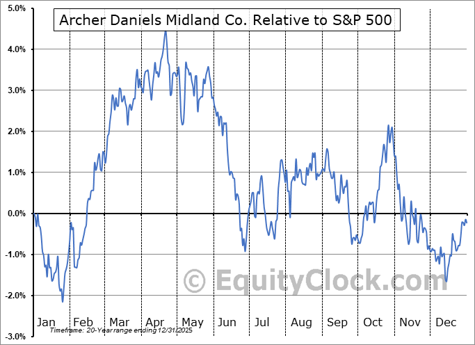 Analysis of the Archer Daniels Midland Co. (NYSE:ADM) seasonal charts above shows that a Buy Date of February 6 and a Sell Date of April 30 has resulted in a geometric average return of 3.5% above the benchmark rate of the S&P 500 Total Return Index over the past 20 years. This seasonal timeframe has shown positive results compared to the benchmark in 14 of those periods. This is a good rate of success and the return strongly outperforms the relative buy-and-hold performance of the stock over the past 20 years by an average of 7.21% per year.