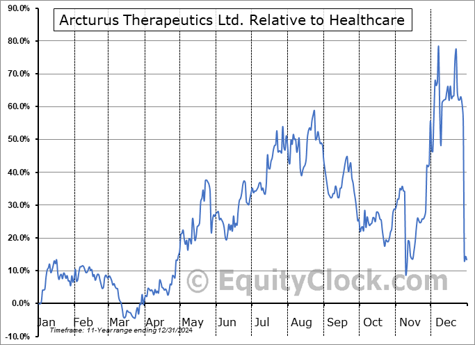 Analysis of the Arcturus Therapeutics Ltd. (NASD:ARCT) seasonal charts above shows that a Buy Date of April 21 and a Sell Date of August 7 has resulted in a geometric average return of 17.8% above the benchmark rate of the S&P 500 Total Return Index over the past 11 years. This seasonal timeframe has shown positive results compared to the benchmark in 9 of those periods. This is a very good rate of success and the return strongly outperforms the relative buy-and-hold performance of the stock over the past 11 years by an average of 44.19% per year.