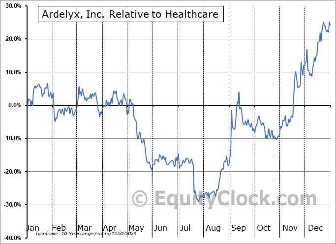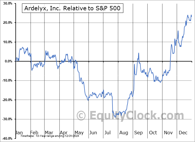 Analysis of the Ardelyx, Inc. (NASD:ARDX) seasonal charts above shows that a Buy Date of August 13 and a Sell Date of December 5 has resulted in a geometric average return of 20.62% above the benchmark rate of the S&P 500 Total Return Index over the past 10 years. This seasonal timeframe has shown positive results compared to the benchmark in 8 of those periods. This is a very good rate of success and the return strongly outperforms the relative buy-and-hold performance of the stock over the past 10 years by an average of 43.57% per year.