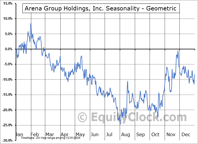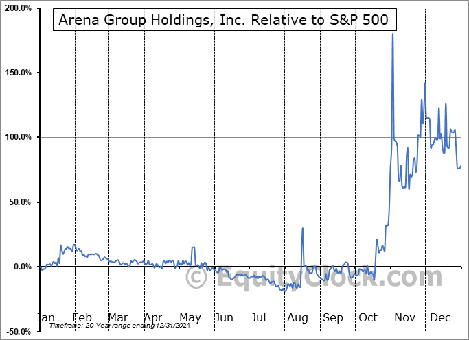 Analysis of the Arena Group Holdings, Inc. (AMEX:MVEND) seasonal charts above shows that a Buy Date of July 29 and a Sell Date of October 18 has resulted in a geometric average return of 9.23% above the benchmark rate of the S&P 500 Total Return Index over the past 20 years. This seasonal timeframe has shown positive results compared to the benchmark in 14 of those periods. This is a good rate of success and the return strongly outperforms the relative buy-and-hold performance of the stock over the past 20 years by an average of 25.71% per year.