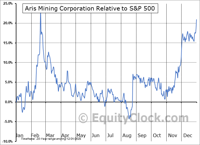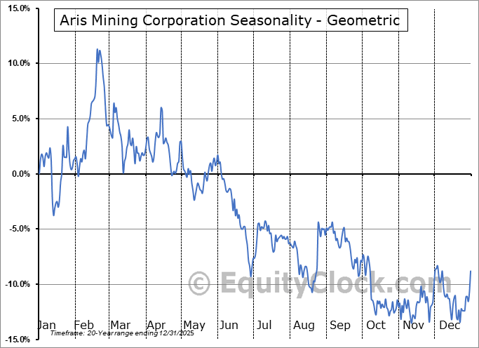Analysis of the Aris Mining Corporation (TSE:ARIS.TO) seasonal charts above shows that a Buy Date of December 22 and a Sell Date of April 12 has resulted in a geometric average return of 7.53% above the benchmark rate of the S&P 500 Total Return Index over the past 20 years. This seasonal timeframe has shown positive results compared to the benchmark in 16 of those periods. This is a very good rate of success and the return strongly outperforms the relative buy-and-hold performance of the stock over the past 20 years by an average of 25.17% per year.