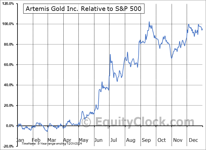 Analysis of the Artemis Gold Inc. (TSXV:ARTG.V) seasonal charts above shows that a Buy Date of February 27 and a Sell Date of July 2 has resulted in a geometric average return of 39.48% above the benchmark rate of the S&P 500 Total Return Index over the past 5 years. This seasonal timeframe has shown positive results compared to the benchmark in 5 of those periods. This is an excellent rate of success, but the return underperforms the relative buy-and-hold performance of the stock over the past 5 years by an average of 0.6% per year.