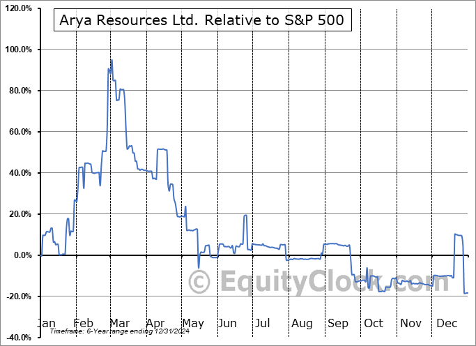 Analysis of the Arya Resources Ltd. (TSXV:RBZ.V) seasonal charts above shows that a Buy Date of December 13 and a Sell Date of March 13 has resulted in a geometric average return of 47.96% above the benchmark rate of the S&P 500 Total Return Index over the past 5 years. This seasonal timeframe has shown positive results compared to the benchmark in 4 of those periods. This is a very good rate of success and the return strongly outperforms the relative buy-and-hold performance of the stock over the past 5 years by an average of 79.08% per year.