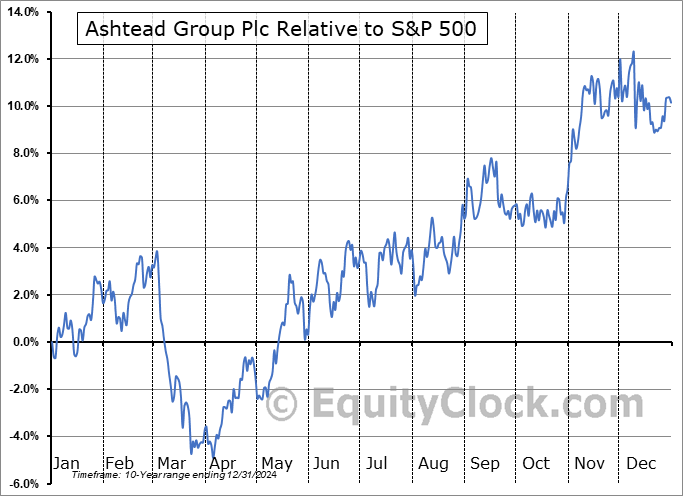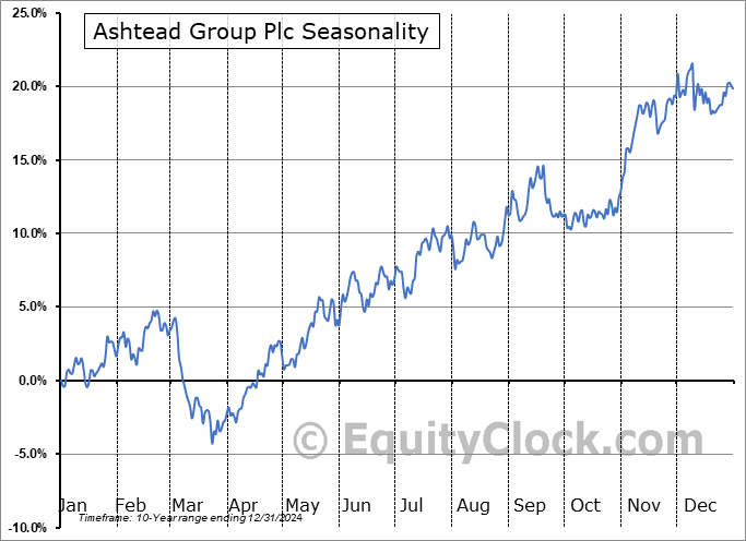 Analysis of the Ashtead Group Plc (OTCMKT:ASHTY) seasonal charts above shows that a Buy Date of October 11 and a Sell Date of January 4 has resulted in a geometric average return of 6.08% above the benchmark rate of the S&P 500 Total Return Index over the past 10 years. This seasonal timeframe has shown positive results compared to the benchmark in 9 of those periods. This is an excellent rate of success and the return strongly outperforms the relative buy-and-hold performance of the stock over the past 10 years by an average of 4.68% per year.