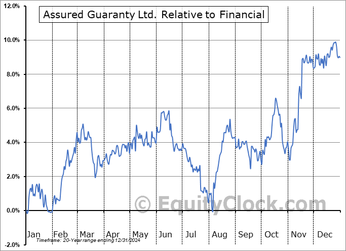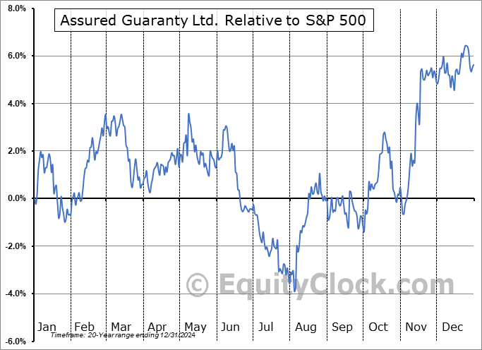 Analysis of the Assured Guaranty Ltd. (NYSE:AGO) seasonal charts above shows that a Buy Date of September 18 and a Sell Date of January 4 has resulted in a geometric average return of 7.61% above the benchmark rate of the S&P 500 Total Return Index over the past 20 years. This seasonal timeframe has shown positive results compared to the benchmark in 17 of those periods. This is a very good rate of success and the return strongly outperforms the relative buy-and-hold performance of the stock over the past 20 years by an average of 8.2% per year.