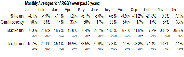 A word of caution: Only 5 years of data is available for shares of ARGGY, perhaps insufficient to create a seasonal profile that accurately gauges the seasonal tendencies influencing the investment. Ideally, while 20 years is preferred, at least 10 years of data is required to perform a seasonal analysis that is considered to be reliable for future seasonal periods.