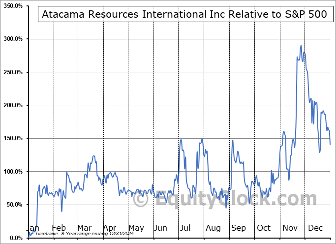 Analysis of the Atacama Resources International Inc (OTCMKT:ACRL) seasonal charts above shows that a Buy Date of December 16 and a Sell Date of March 10 has resulted in a geometric average return of 63.03% above the benchmark rate of the S&P 500 Total Return Index over the past 8 years. This seasonal timeframe has shown positive results compared to the benchmark in 7 of those periods. This is a very good rate of success and the return strongly outperforms the relative buy-and-hold performance of the stock over the past 8 years by an average of 107.23% per year.