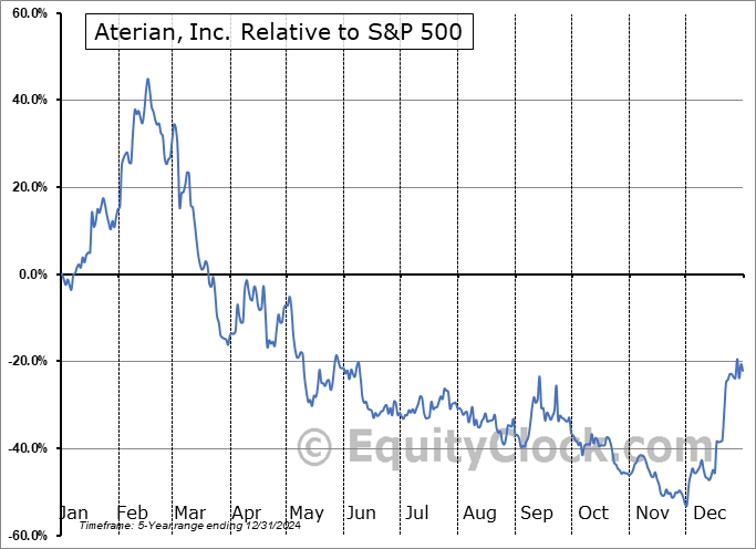 Analysis of the Aterian, Inc. (NASD:ATER) seasonal charts above shows that a Buy Date of November 23 and a Sell Date of February 15 has resulted in a geometric average return of 32.68% above the benchmark rate of the S&P 500 Total Return Index over the past 5 years. This seasonal timeframe has shown positive results compared to the benchmark in 3 of those periods. This is a fair rate of success and the return strongly outperforms the relative buy-and-hold performance of the stock over the past 5 years by an average of 87.85% per year.