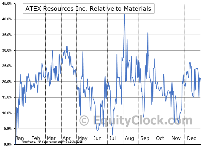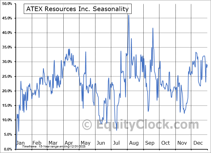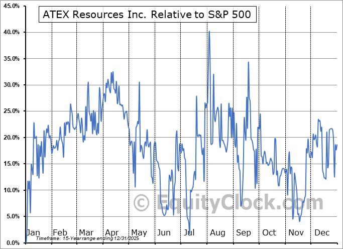 Analysis of the ATEX Resources Inc. (TSXV:ATX.V) seasonal charts above shows that a Buy Date of November 14 and a Sell Date of February 2 has resulted in a geometric average return of 14.88% above the benchmark rate of the S&P 500 Total Return Index over the past 15 years. This seasonal timeframe has shown positive results compared to the benchmark in 12 of those periods. This is a very good rate of success and the return strongly outperforms the relative buy-and-hold performance of the stock over the past 15 years by an average of 33.84% per year.
