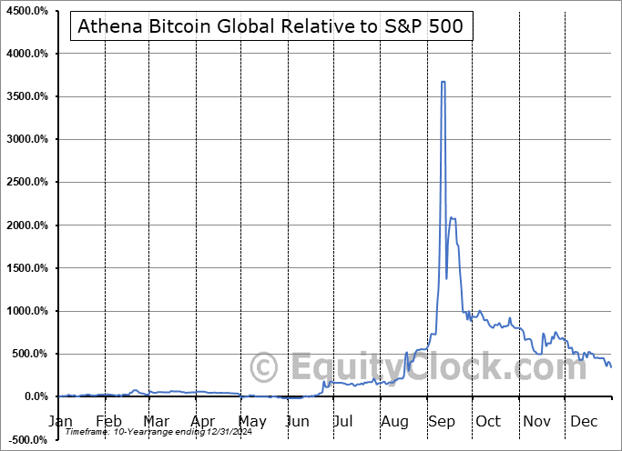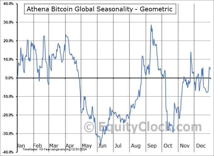 Analysis of the Athena Bitcoin Global (OTCMKT:ABIT) seasonal charts above shows that a Buy Date of July 20 and a Sell Date of November 11 has resulted in a geometric average return of 28.78% above the benchmark rate of the S&P 500 Total Return Index over the past 10 years. This seasonal timeframe has shown positive results compared to the benchmark in 7 of those periods. This is a good rate of success and the return strongly outperforms the relative buy-and-hold performance of the stock over the past 10 years by an average of 36.2% per year.