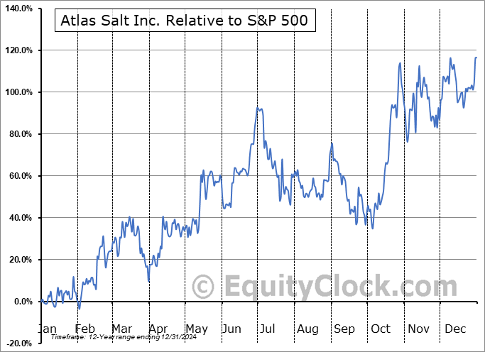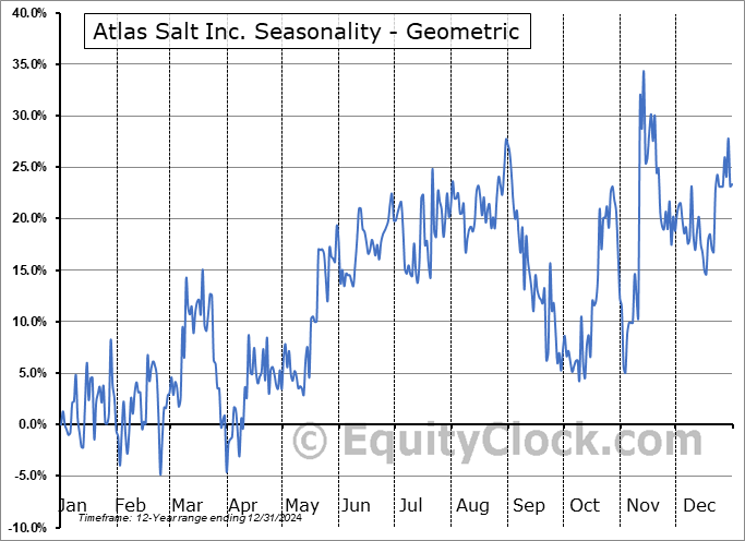 Analysis of the Atlas Salt Inc. (TSXV:SALT.V) seasonal charts above shows that a Buy Date of October 5 and a Sell Date of January 10 has resulted in a geometric average return of 8.07% above the benchmark rate of the S&P 500 Total Return Index over the past 12 years. This seasonal timeframe has shown positive results compared to the benchmark in 9 of those periods. This is a good rate of success and the return slightly outperforms the relative buy-and-hold performance of the stock over the past 12 years by an average of 0.13% per year.
