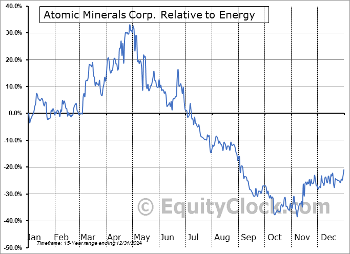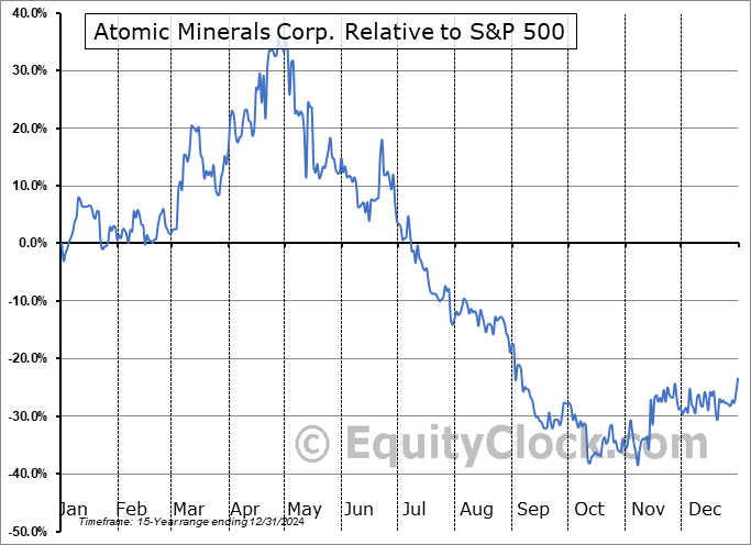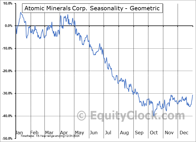 Analysis of the Atomic Minerals Corp. (TSXV:ATOM.V) seasonal charts above shows that a Buy Date of November 7 and a Sell Date of February 9 has resulted in a geometric average return of 12.85% above the benchmark rate of the S&P 500 Total Return Index over the past 15 years. This seasonal timeframe has shown positive results compared to the benchmark in 12 of those periods. This is a very good rate of success and the return strongly outperforms the relative buy-and-hold performance of the stock over the past 15 years by an average of 51.87% per year.