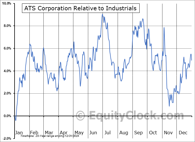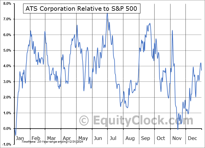 Analysis of the ATS Corporation (TSE:ATS.TO) seasonal charts above shows that a Buy Date of November 15 and a Sell Date of February 3 has resulted in a geometric average return of 8.65% above the benchmark rate of the S&P 500 Total Return Index over the past 20 years. This seasonal timeframe has shown positive results compared to the benchmark in 17 of those periods. This is a very good rate of success and the return strongly outperforms the relative buy-and-hold performance of the stock over the past 20 years by an average of 11.59% per year.