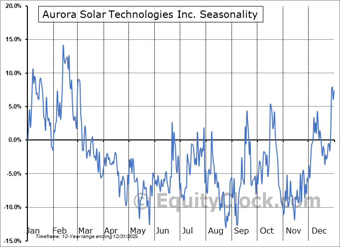 Analysis of the Aurora Solar Technologies Inc. (OTCMKT:AACTF) seasonal charts above shows that a Buy Date of December 26 and a Sell Date of March 19 has resulted in a geometric average return of 0.82% above the benchmark rate of the S&P 500 Total Return Index over the past 10 years. This seasonal timeframe has shown positive results compared to the benchmark in 7 of those periods. This is a good rate of success and the return strongly outperforms the relative buy-and-hold performance of the stock over the past 10 years by an average of 38.6% per year.