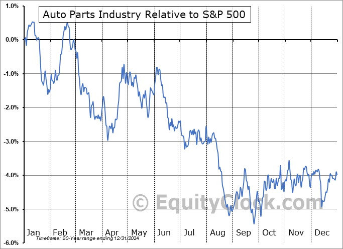 Analysis of the Auto Parts Industry seasonal charts above shows that a Buy Date of October 20 and a Sell Date of January 13 has resulted in a geometric average return of 0.86% above the benchmark rate of the S&P 500 Total Return Index over the past 20 years. This seasonal timeframe has shown positive results compared to the benchmark in 14 of those periods. This is a good rate of success and the return strongly outperforms the relative buy-and-hold performance of the stock over the past 20 years by an average of 6.67% per year.