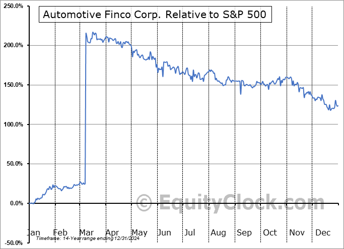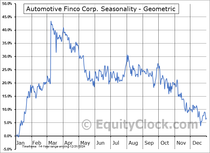 Analysis of the Automotive Finco Corp. (TSXV:AFCC.V) seasonal charts above shows that a Buy Date of December 4 and a Sell Date of March 1 has resulted in a geometric average return of 17.17% above the benchmark rate of the S&P 500 Total Return Index over the past 14 years. This seasonal timeframe has shown positive results compared to the benchmark in 11 of those periods. This is a good rate of success and the return strongly outperforms the relative buy-and-hold performance of the stock over the past 14 years by an average of 23.14% per year.