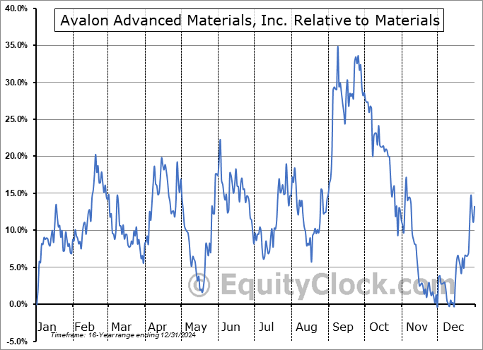 Analysis of the Avalon Advanced Materials, Inc. (OTCMKT:AVLNF) seasonal charts above shows that a Buy Date of November 27 and a Sell Date of February 27 has resulted in a geometric average return of 15.7% above the benchmark rate of the S&P 500 Total Return Index over the past 16 years. This seasonal timeframe has shown positive results compared to the benchmark in 13 of those periods. This is a very good rate of success and the return strongly outperforms the relative buy-and-hold performance of the stock over the past 16 years by an average of 44.07% per year.