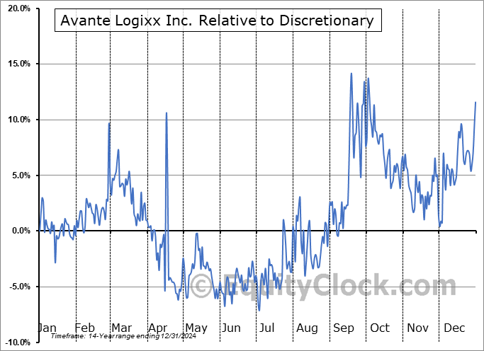 Analysis of the Avante Logixx Inc. (TSXV:XX.V) seasonal charts above shows that a Buy Date of December 13 and a Sell Date of March 7 has resulted in a geometric average return of 8.05% above the benchmark rate of the S&P 500 Total Return Index over the past 14 years. This seasonal timeframe has shown positive results compared to the benchmark in 10 of those periods. This is a good rate of success and the return strongly outperforms the relative buy-and-hold performance of the stock over the past 14 years by an average of 17.95% per year.