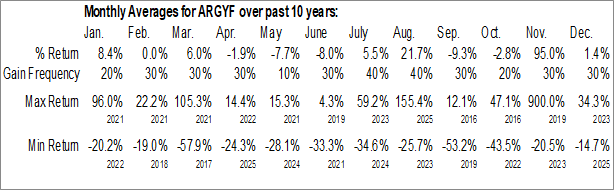 A word of caution: Only 9 years of data is available for shares of ARGYF, perhaps insufficient to create a seasonal profile that accurately gauges the seasonal tendencies influencing the investment. Ideally, while 20 years is preferred, at least 10 years of data is required to perform a seasonal analysis that is considered to be reliable for future seasonal periods.
