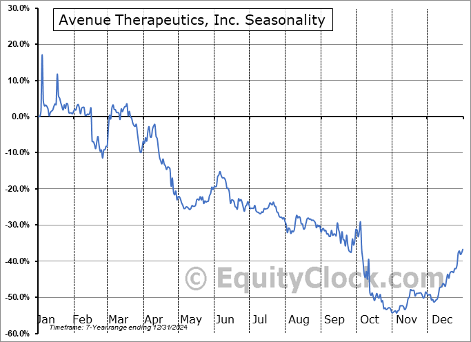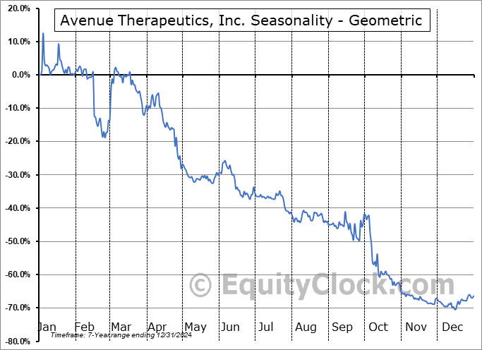 Analysis of the Avenue Therapeutics, Inc. (NASD:ATXI) seasonal charts above shows that a Buy Date of December 15 and a Sell Date of March 13 has resulted in a geometric average return of 7.58% above the benchmark rate of the S&P 500 Total Return Index over the past 7 years. This seasonal timeframe has shown positive results compared to the benchmark in 5 of those periods. This is a good rate of success and the return strongly outperforms the relative buy-and-hold performance of the stock over the past 7 years by an average of 77.96% per year.