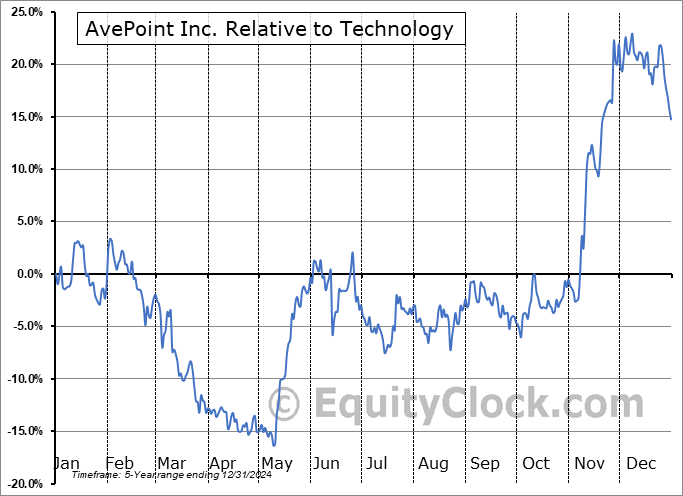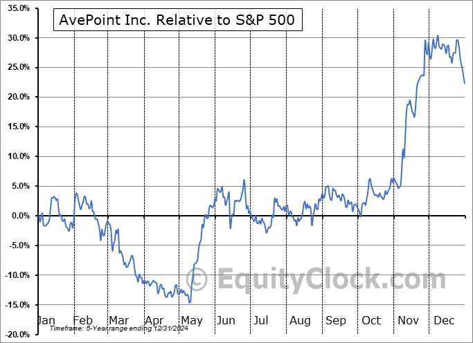 Analysis of the AvePoint Inc. (NASD:AVPT) seasonal charts above shows that a Buy Date of April 29 and a Sell Date of July 23 has resulted in a geometric average return of 10.97% above the benchmark rate of the S&P 500 Total Return Index over the past 5 years. This seasonal timeframe has shown positive results compared to the benchmark in 5 of those periods. This is an excellent rate of success and the return strongly outperforms the relative buy-and-hold performance of the stock over the past 5 years by an average of 14.16% per year.