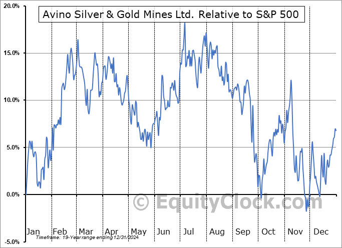 Analysis of the Avino Silver & Gold Mines Ltd. (AMEX:ASM) seasonal charts above shows that a Buy Date of December 12 and a Sell Date of March 22 has resulted in a geometric average return of 18% above the benchmark rate of the S&P 500 Total Return Index over the past 19 years. This seasonal timeframe has shown positive results compared to the benchmark in 17 of those periods. This is a very good rate of success and the return strongly outperforms the relative buy-and-hold performance of the stock over the past 19 years by an average of 30.76% per year.
