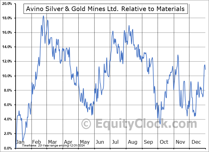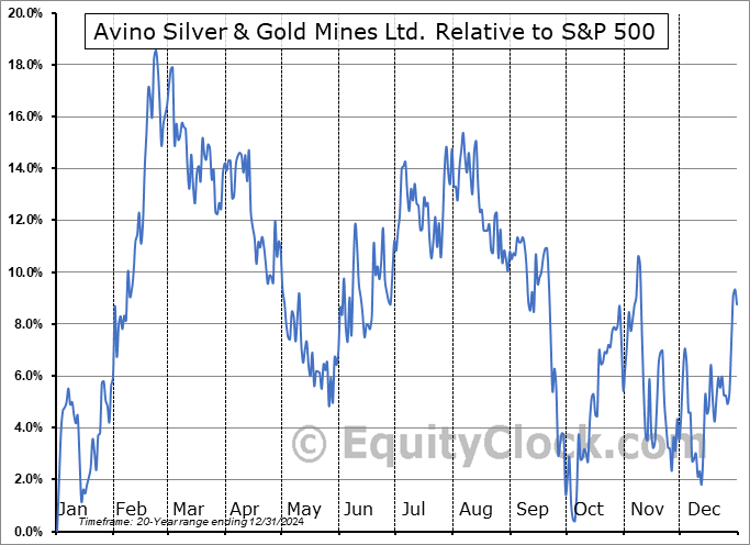 Analysis of the Avino Silver & Gold Mines Ltd. (TSE:ASM.TO) seasonal charts above shows that a Buy Date of December 20 and a Sell Date of March 22 has resulted in a geometric average return of 17.9% above the benchmark rate of the S&P 500 Total Return Index over the past 20 years. This seasonal timeframe has shown positive results compared to the benchmark in 17 of those periods. This is a very good rate of success and the return strongly outperforms the relative buy-and-hold performance of the stock over the past 20 years by an average of 26.9% per year.