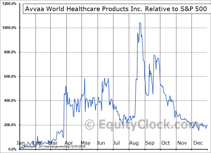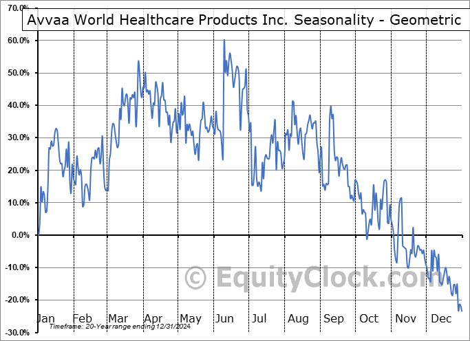 Analysis of the Avvaa World Healthcare Products Inc. (OTCMKT:AVVH) seasonal charts above shows that a Buy Date of December 26 and a Sell Date of March 28 has resulted in a geometric average return of 39.45% above the benchmark rate of the S&P 500 Total Return Index over the past 20 years. This seasonal timeframe has shown positive results compared to the benchmark in 14 of those periods. This is a good rate of success and the return strongly outperforms the relative buy-and-hold performance of the stock over the past 20 years by an average of 69.91% per year.