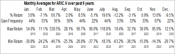 A word of caution: Only 9 years of data is available for shares of ARIC.V, perhaps insufficient to create a seasonal profile that accurately gauges the seasonal tendencies influencing the investment. Ideally, while 20 years is preferred, at least 10 years of data is required to perform a seasonal analysis that is considered to be reliable for future seasonal periods.
